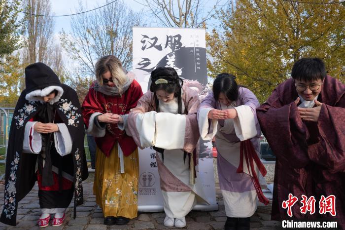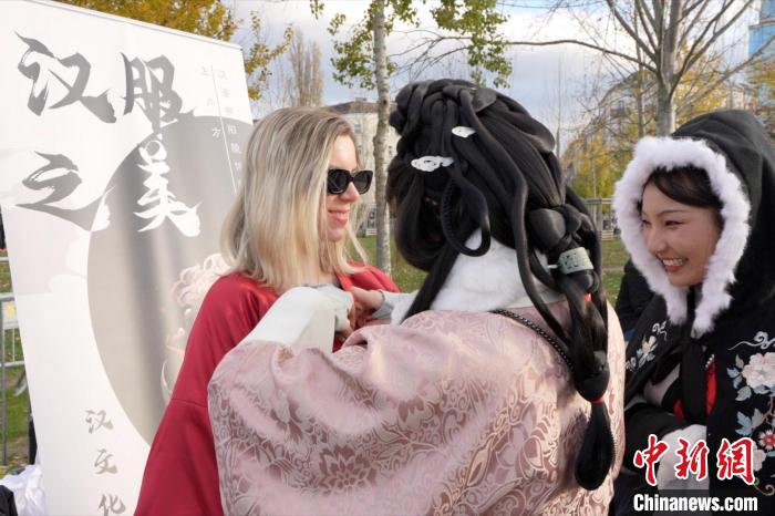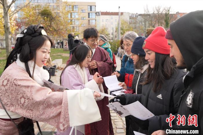 中新网柏林11月26日电 “汉服之美·汉服秀体验活动”26日在柏林墙公园举行。该活动由汉景帝阳陵博物院与德国汉文化艺术交流中心共同举办,吸引了众多旅行者与往来行人互动。