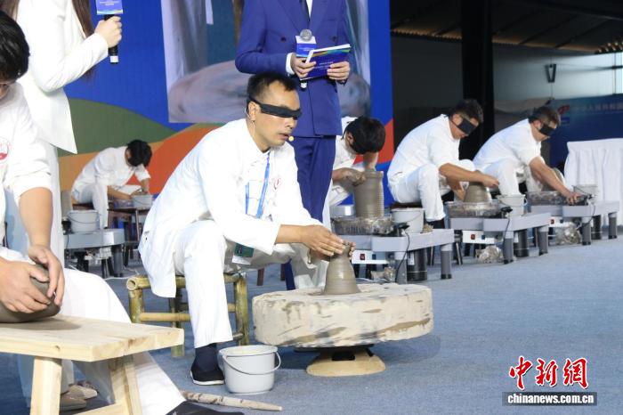 许昌陶瓷职业学院钧瓷蒙眼拉坯项目展示。 张楠 摄