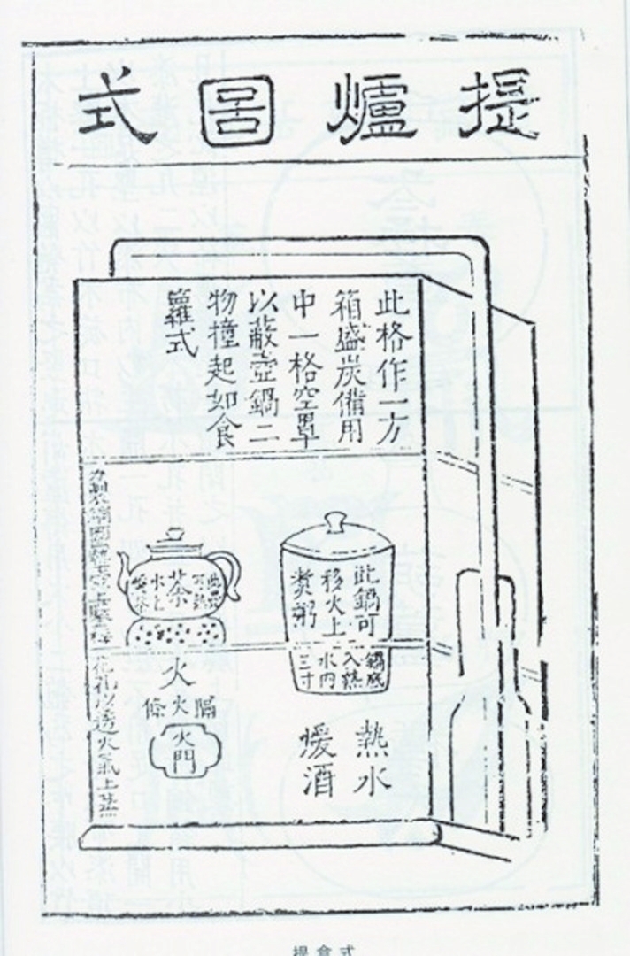 明代戏曲家高濂编撰的《遵生八笺》,可谓士大夫精致生活的指导书,书中仔细介绍了提炉的形制与结构,还附上了插图。书云:“式如提盒,亦余制也。高一尺八寸,阔一尺,长一尺二寸,作三撞。下层一格,如方匣,内用铜造水火炉,身如匣方,坐嵌匣内。中分二孔,左孔炷火,置茶壶以供茶;右孔注汤,置一桶子小镬有盖,顿汤中煮酒。长日午余,此镬可煮粥供客。傍凿一小孔,出灰进风。其壶镬迥出炉格上,太露不雅,外作如下格方匣一格,但不用底以罩之,便壶镬不外见也。一虚一实共二格,上加一格,置底盖以装炭,总三格成一架,上可箾关,与提盒作一副也。”