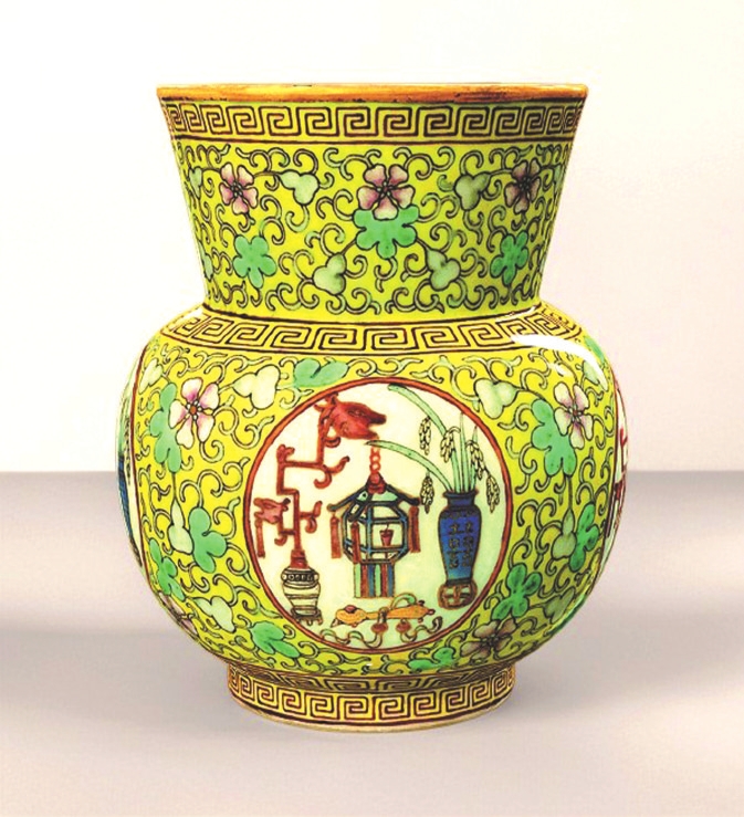 故宫博物院收藏的清代粉彩葫芦万代五谷丰登纹渣斗,内壁绘粉彩缠枝葫芦纹,藤蔓相连,花果繁茂,寓意“子孙绵延”“多子多福”;外壁黄地亦绘相同葫芦纹,设四处圆形开光,内有宫灯、花瓶、如意、稻穗等,寓意“平安如意”“五谷丰登”。开光内花瓶饰“囍”字,表明为皇帝大婚用瓷,既祈子嗣繁衍,又添喜庆吉祥。整器色彩明艳,纹饰繁密华丽,尽显清代晚期宫廷装饰的典型风格。