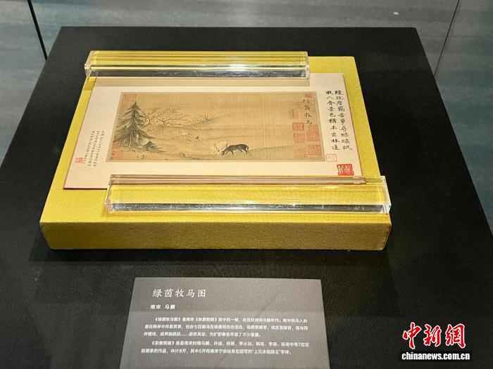 《绿茵牧马图》为国家一级文物,由南宋宫廷画师马麟所作。画中牧马人斜靠在桃林中休息赏景,任由七匹骏马在绿茵间自由活动,或俯首啃草,或与同伴嬉戏,或奔跑跳跃……姿态灵动,为旷野春色平添了不少意趣。杜芝明表示,为最大限度地保护文物,该展品仅面向公众展出一个月。