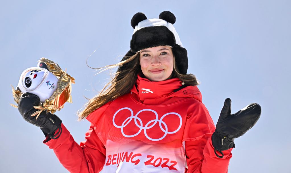 2022年2月18日,谷爱凌在北京2022年冬奥会自由式滑雪女子U型场地技巧颁发纪念品仪式上。新华社记者肖艺九摄