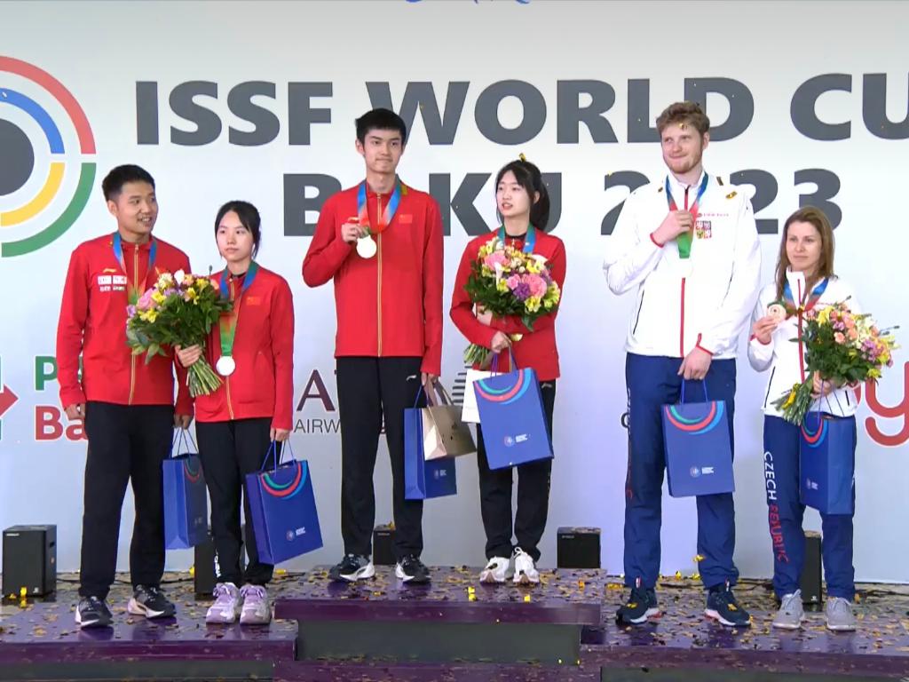 新华社北京5月11日电 据国际射击运动联合会官网11日消息,在步手枪射击世界杯巴库站第二个比赛日的争夺中,两对中国组合黄雨婷/盛李豪和王芝琳/杨皓然包揽10米气步枪混合团体的金牌和银牌。