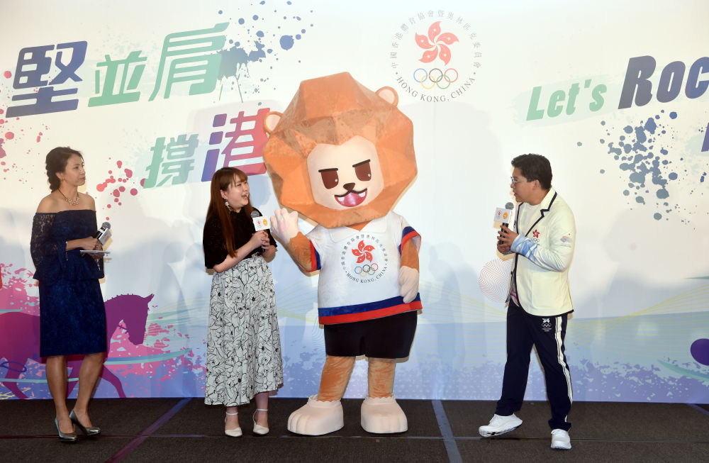 6月15日,中国香港代表团吉祥物“坚仔”(右二)亮相。新华社记者卢炳辉摄
