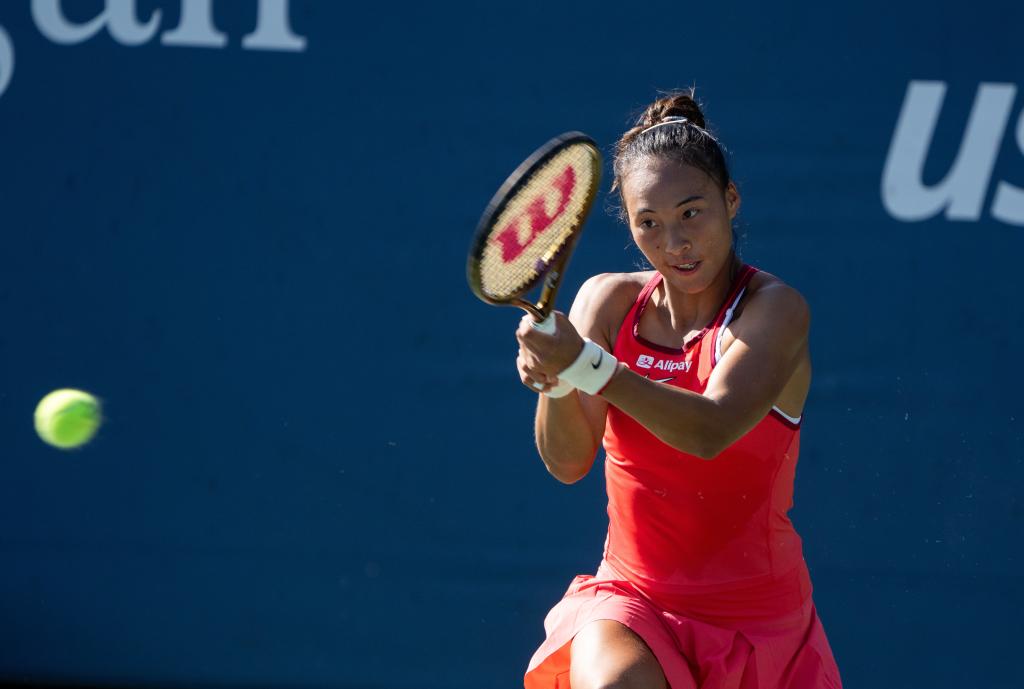 9月2日,郑钦文在比赛中回球。新华社记者 刘杰 摄
