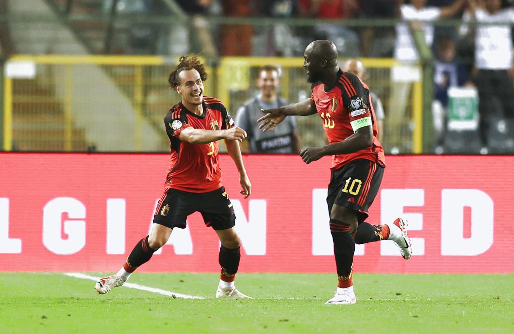 9月12日,比利时队球员卢卡库(右)进球后和队友蒂特庆祝。新华社记者赵丁喆摄