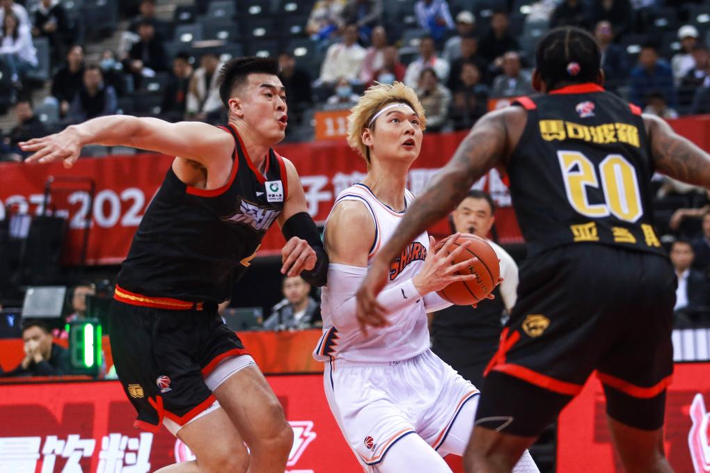 1月2日,上海队球员王哲林(中)在比赛中进攻。新华社发(彭志刚摄)