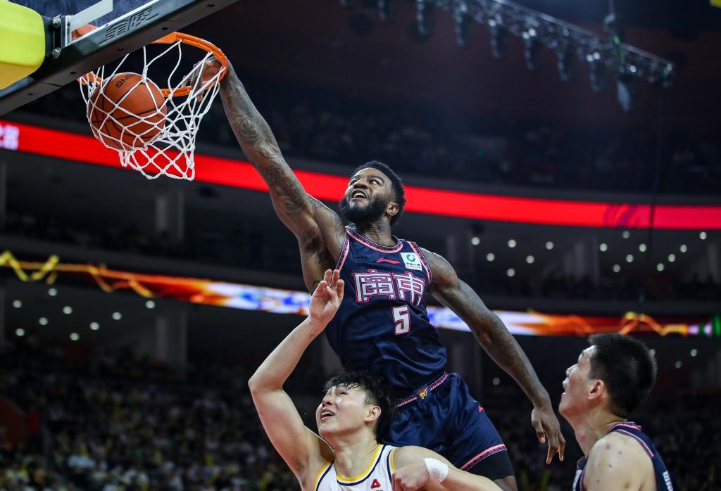 4月18日,广东队球员贝尔(上)在比赛中扣篮。新华社发(郑家雄摄)