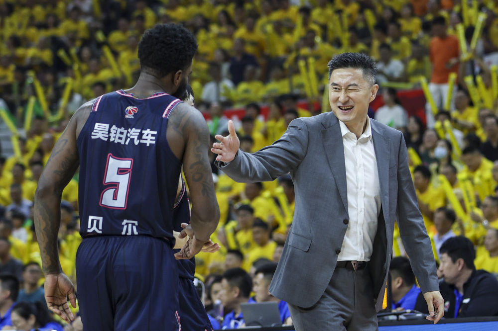 5月6日,广东队主教练杜锋(右)鼓励球员贝尔。新华社发(郑家雄摄)