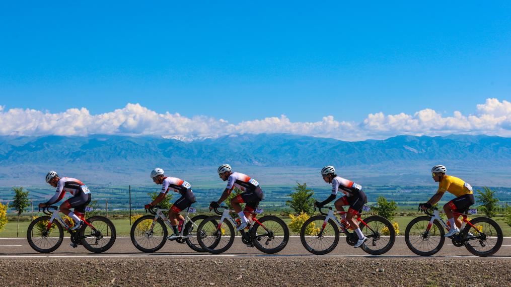 5月30日,第十六届环赛里木湖赛第三赛段比赛中,运动员正在骑行。新华社发(于苏甫·艾尼 摄)