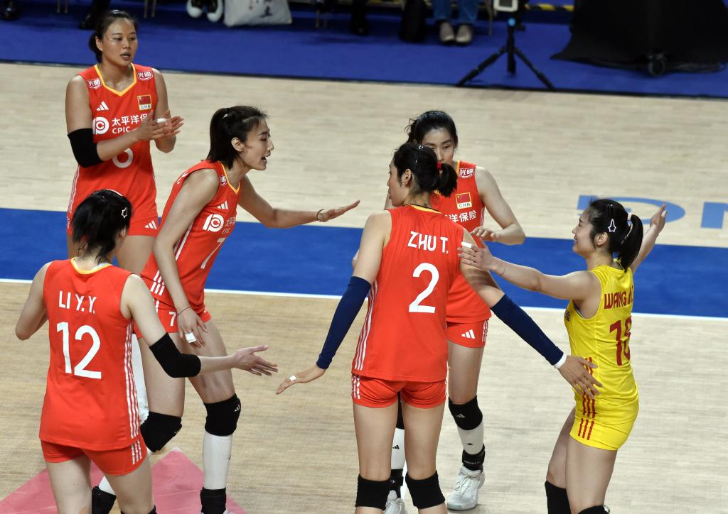 6月11日,中国队球员庆祝得分。新华社记者 卢炳辉 摄