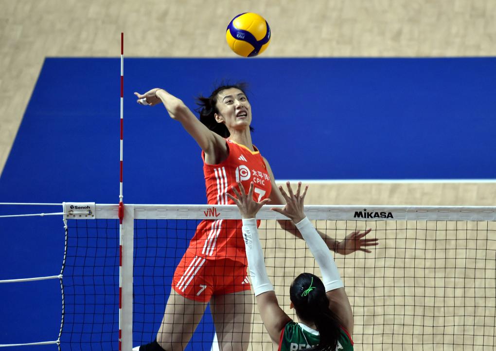 6月11日,中国队球员朱婷(中上)在比赛中进攻。新华社记者 朱炜 摄