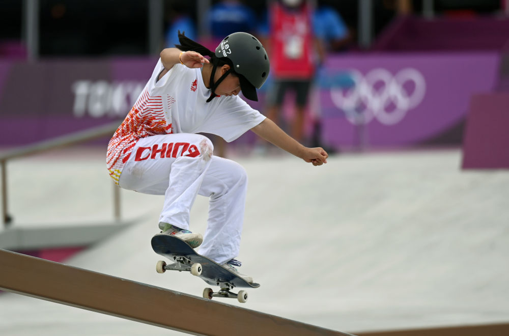 2021年7月26日,中国选手曾文蕙在比赛中。当日,在东京奥运会女子滑板街式赛中,中国选手曾文蕙闯入决赛,并最终获得第六名。新华社记者 李尕 摄