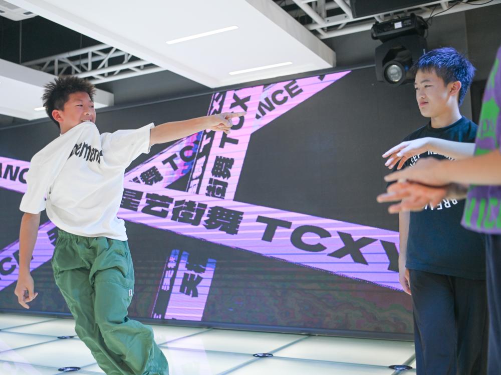 7月16日,张哲瀚(左一)在练习霹雳舞。新华社记者 王曦 摄