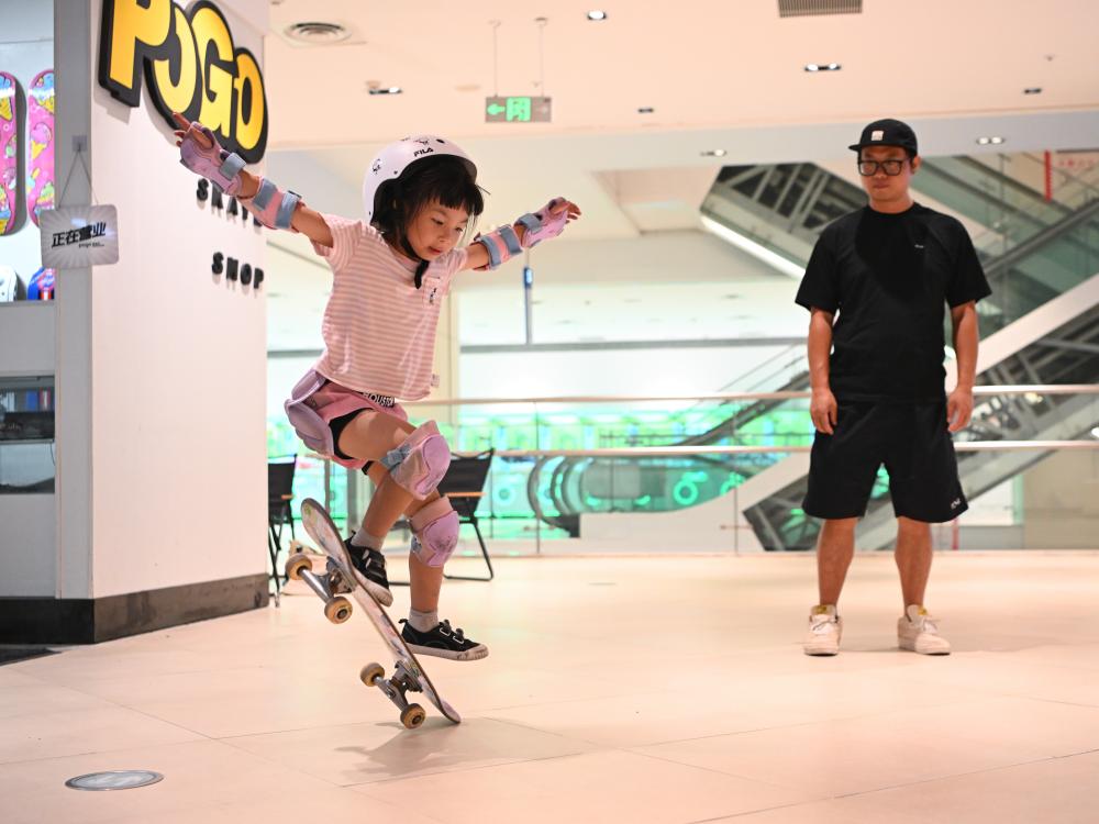 7月17日,閤灵暄(左二)正在进行滑板训练。新华社记者 王曦 摄