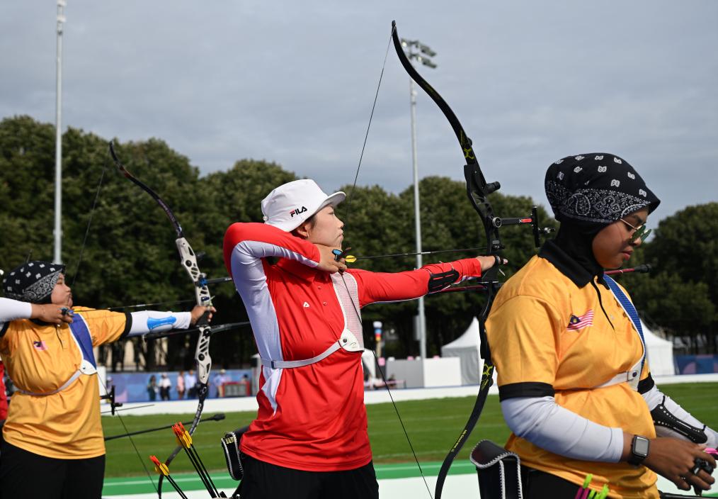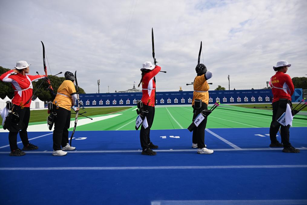 7月25日,巴黎奥运会射箭女子个人排位赛在巴黎荣军院举行,中国选手杨晓蕾(中)在比赛中。新华社记者 贺灿铃 摄