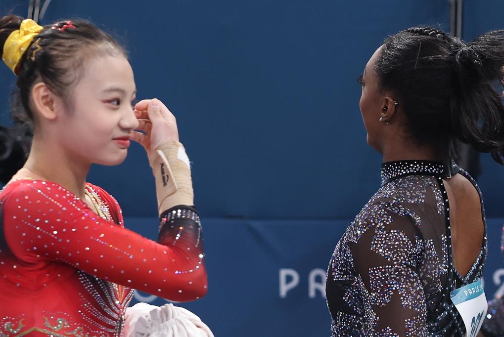 7月28日,美国选手拜尔斯(右)与中国选手邱祺缘在转换项目。当日,巴黎奥运会体操女子资格赛在贝尔西体育馆举行。 新华社记者 曹灿 摄