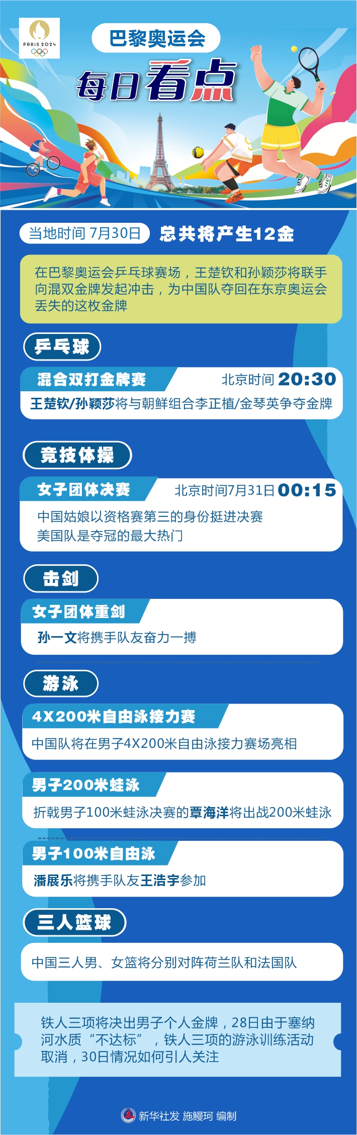 还有一些项目将拉开战幕。中国三人男、女篮将分别对阵荷兰队和法国队。铁人三项将决出男子个人金牌,28日由于塞纳河水质“不达标”,铁人三项的游泳训练活动取消,30日情况如何引人关注。
