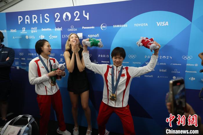 当地时间7月31日,在巴黎奥运会跳水女子双人10米台项目中,中国队组合陈芋汐/全红婵获得冠军。谷爱凌(中)在赛后化身粉丝与陈芋汐(左)、全红婵合影。 中新社记者 富田 摄