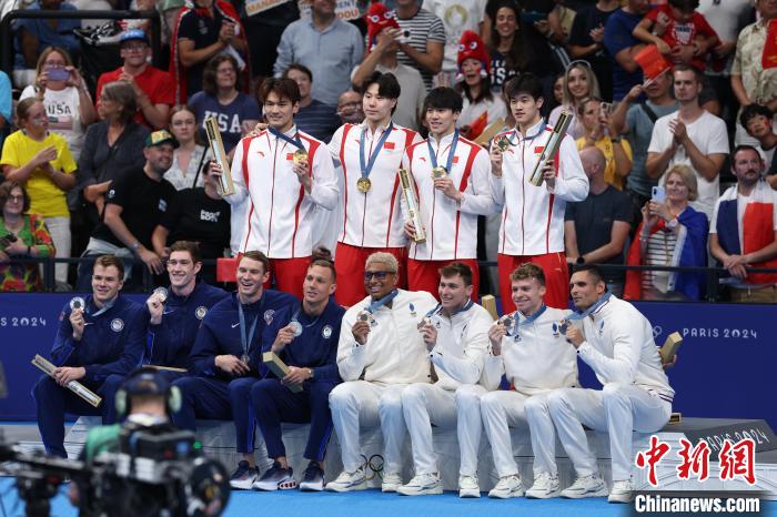 当地时间8月4日,在巴黎奥运会游泳项目男子4x100米混合泳接力决赛中,由徐嘉余、覃海洋、孙佳俊、潘展乐组成的中国队夺得金牌。图为获奖运动员合影。 中新社记者 富田 摄