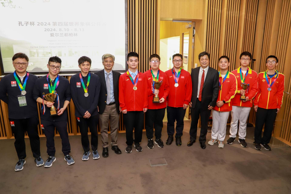 男子团体前三名:中国队(中)、中国香港队(左一至左三)、中国上海棋院队