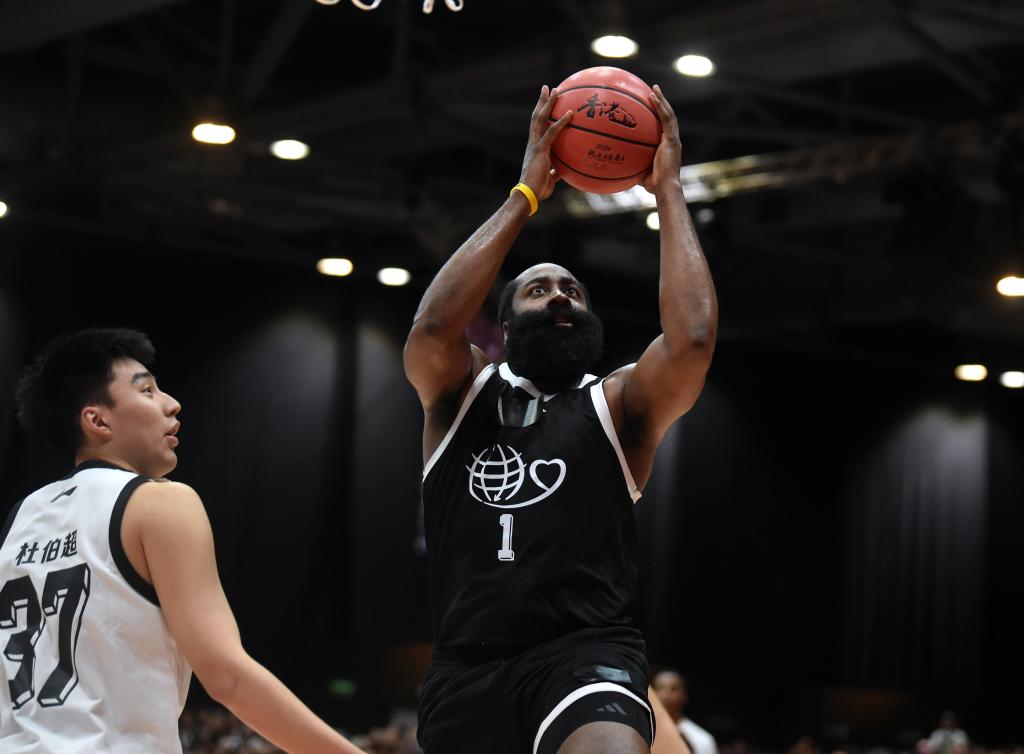 尽管这不是一场正式比赛,但哈登和保罗·乔治、巴特勒和库兹马等球星打得认真、尽兴,第一节他们就以46:15领先;半场结束,他们又将优势扩大到70:37。