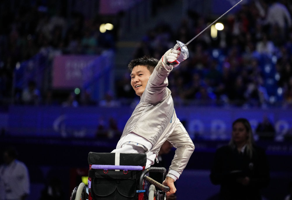作为本届奥运会和残奥会最受好评的场馆之一,大皇宫3日迎来轮椅击剑首个比赛日的争夺,中国队当天斩获2枚金牌。第三次参加残奥会的男子佩剑B级世锦赛、残奥会双料冠军冯彦可,在该项目个人决赛中和波兰选手东布罗夫斯基展开激烈较量。比赛尾声双方战至14平,关键时刻,冯彦可展现了大心脏,一剑封喉绝杀对手,成功卫冕。