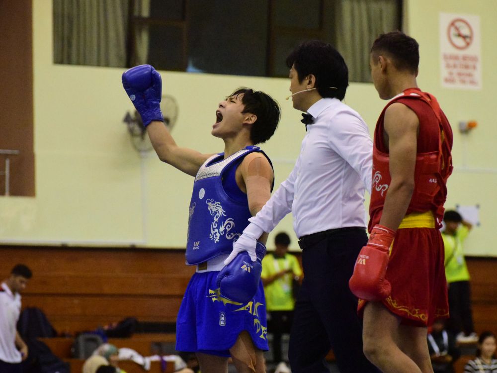 9月29日,在文莱举行的第九届世界青少年武术锦标赛散打男子56公斤级决赛中,中国选手冯俊杰战胜乌兹别克斯坦选手奥季洛夫,获得冠军。新华社记者 李萌 摄