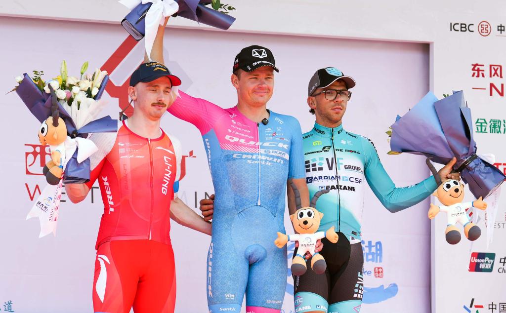 7月9日,赛段冠军爱沙尼亚快客车队车手拉亚斯·马丁(中)、亚军李宁之星车队车手谢尔比·亚历山大(左)、季军意大利巴迪亚尼车队车手扎农塞洛·恩洛科在领奖台上合影。新华社记者 齐芷玥 摄