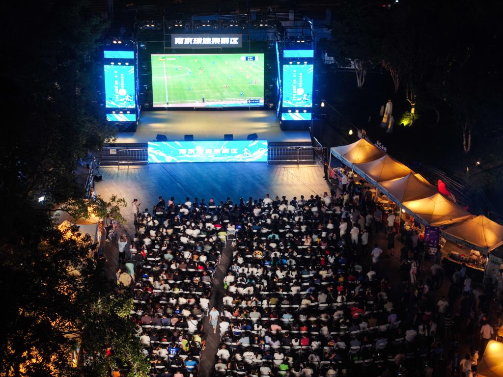 8月17日,球迷在南京一个露天屏幕前观看2025江苏省城市足球联赛(“苏超”)第九轮比赛。新华社记者 季春鹏 摄