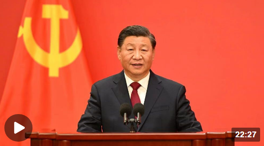 在中国共产党第二十届中央委员会第一次全体会议上当选的中共中央总书记习近平和中共中央政治局常委李强、赵乐际、王沪宁、蔡奇、丁薛祥、李希,23日中午在人民大会堂同采访中共二十大的中外记者见面。习近平发表重要讲话。