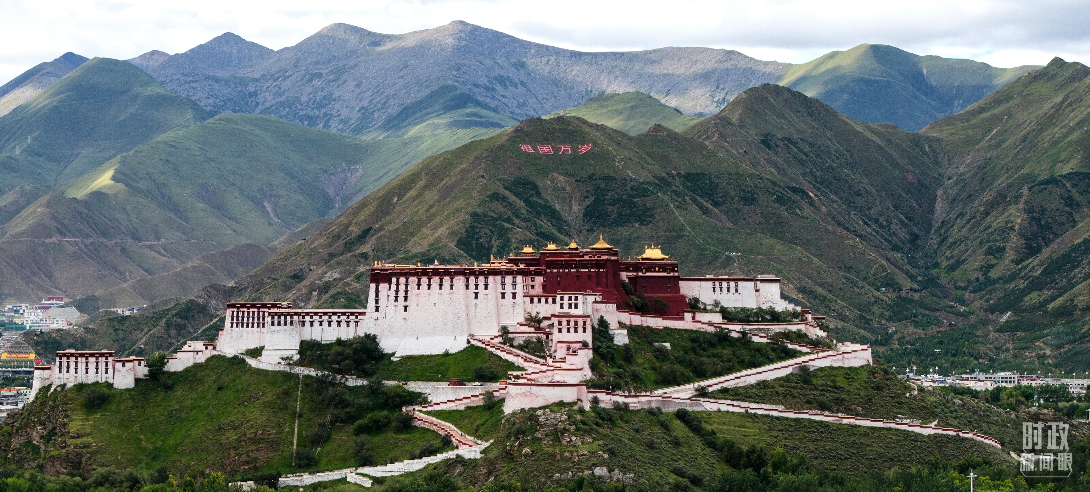 △拉萨街头庆祝西藏自治区成立60周年的巨型横幅。(总台央视记者曹亚星拍摄)