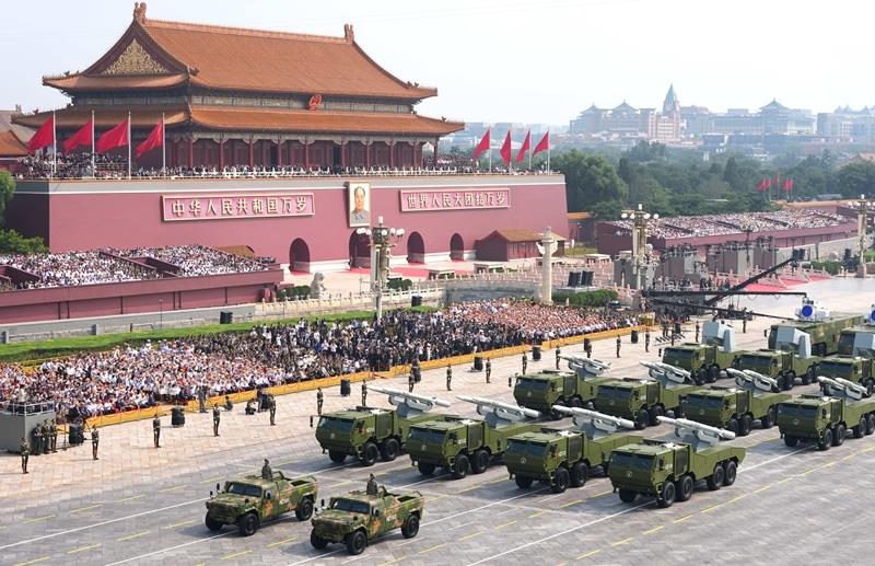 △2025年9月3日,纪念中国人民抗日战争暨世界反法西斯战争胜利80周年大会在北京隆重举行。这是舰载防空武器方队接受检阅。