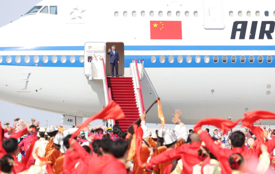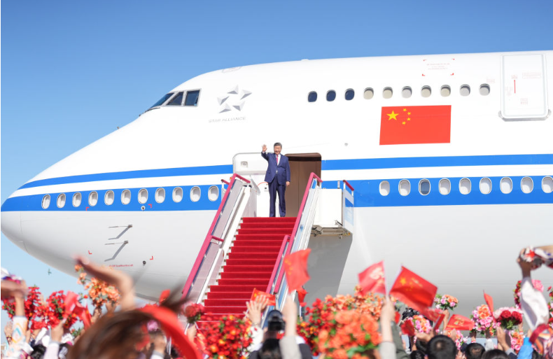 机场到住地沿途,花团锦簇、彩旗飘扬。人群如潮水涌到道路两旁,挥动的手臂与旗帜汇成海洋,一颗颗心激动澎湃。习近平总书记向沿途群众频频挥手、亲切致意。