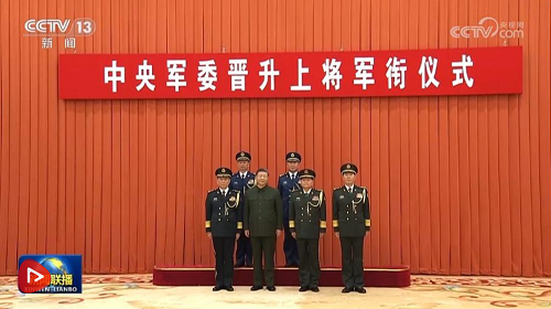 习近平向晋升上将军衔的东部战区司令员杨志斌、中部战区司令员韩胜延颁发命令状,表示祝贺。佩戴上将军衔的2位军官向习近平敬礼,向参加仪式的全体同志敬礼,全场响起热烈掌声。