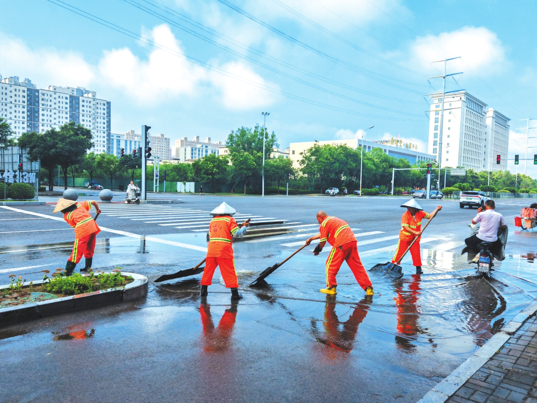 8月5日凌晨,我市降雨天气造成城区部分道路路面积水。清晨,环卫工人积极应对雨情,对辖区内路段开展排水清淤工作,保障市民日常出行。图为环卫工人在紫檀街路口清理积水。本报记者王阳摄