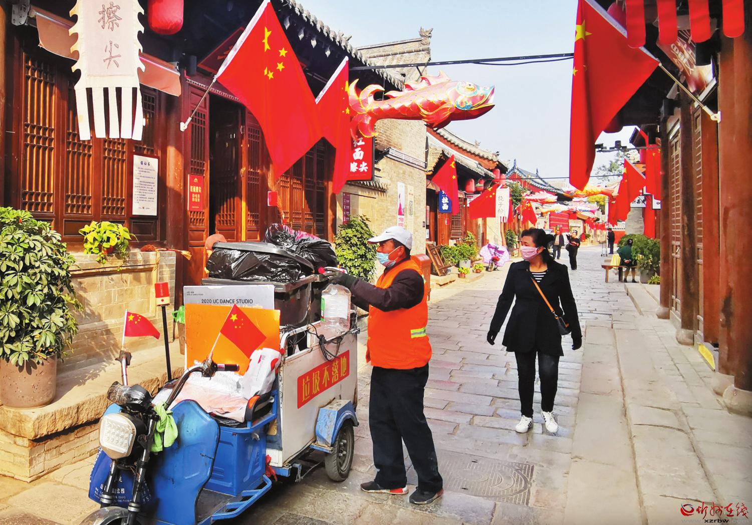 10月14日,忻州古城的环卫工人正在上门收运沿街商户产生的垃圾,保证日产日清,垃圾不落地。(张存良 摄)
