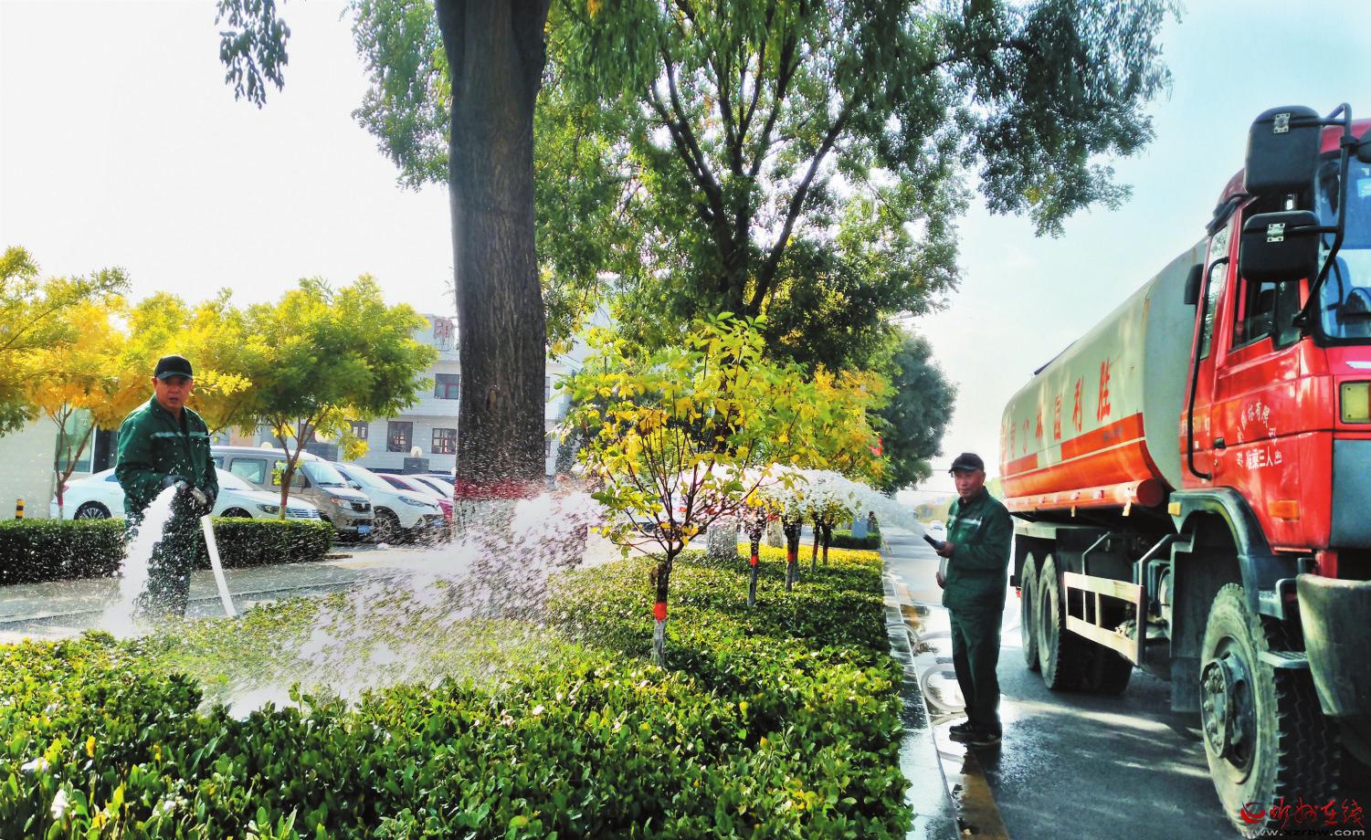 10月15日,园林工人正在忻州城区长征西街浇灌道路两旁的绿植,精心养护,让绿化成果成为城市的亮点。 (宫清华 摄)