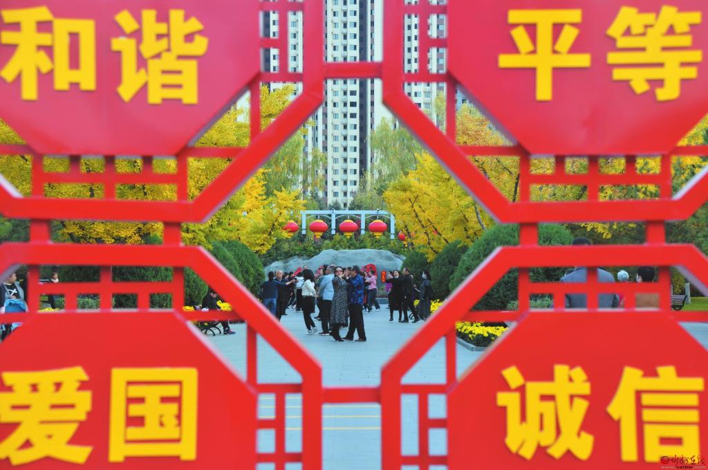 在我市中心城区的公园、广场和城市绿地中,以社会主义核心价值观、文明城市创建、优秀传统文化等为主题的宣传展板、景观造型随处可见,在弘扬传统文化、传播城市文明的同时,给市民带来视觉上的艺术享受,让游客在游园赏景中受到熏陶。 (张存良 摄)