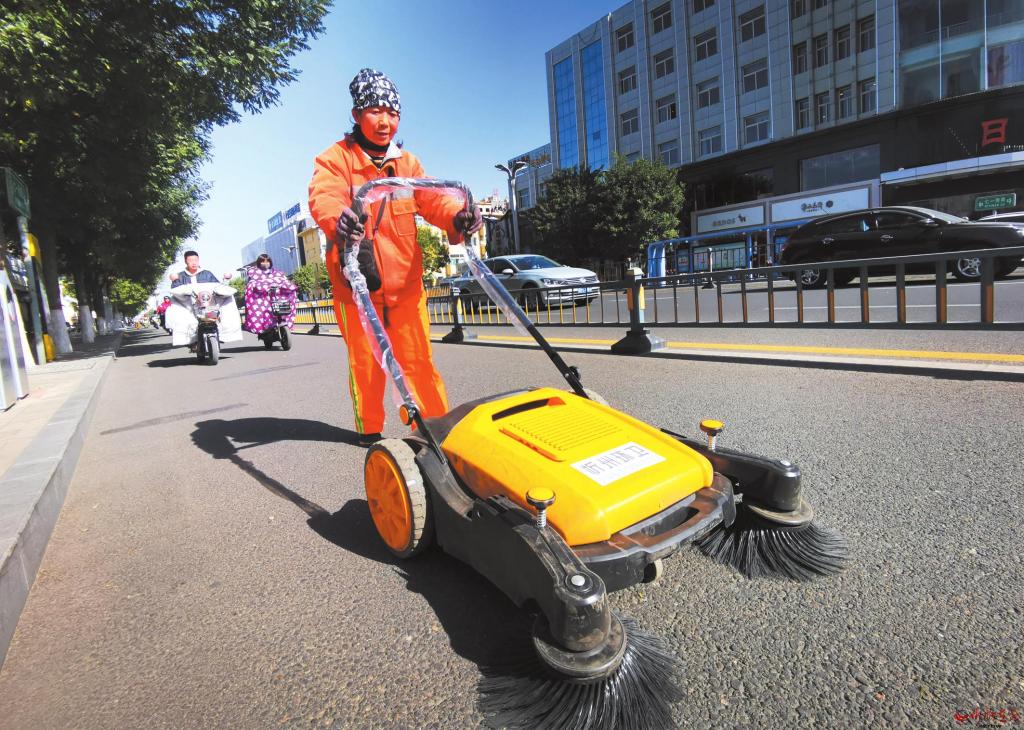10月21日,环卫工人在城区七一南路用新配置的无尘手推式扫地机进行清扫作业。为巩固提升创文成果,市环卫处狠抓清扫保洁、严控二次污染,多举措提升卫生质量,确保市民有良好的工作和生活环境。 (张存良 摄)