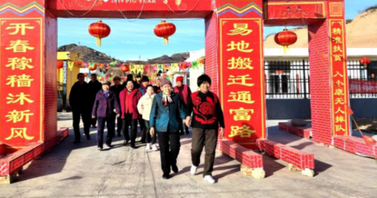 大峪坪易地搬迁点是晋中市太谷区完成整村搬迁入住的第一村,春节前夕,村两委班子张罗着将小区布置一新,大门口制作了喜庆醒目的迎春牌楼,牌楼两侧写有群众自编的新春联,上联是:开春稼穑沐新风,下联是:易地搬迁通富路。东侧的门柱上写着:精准扶贫,入小康无人掉队。