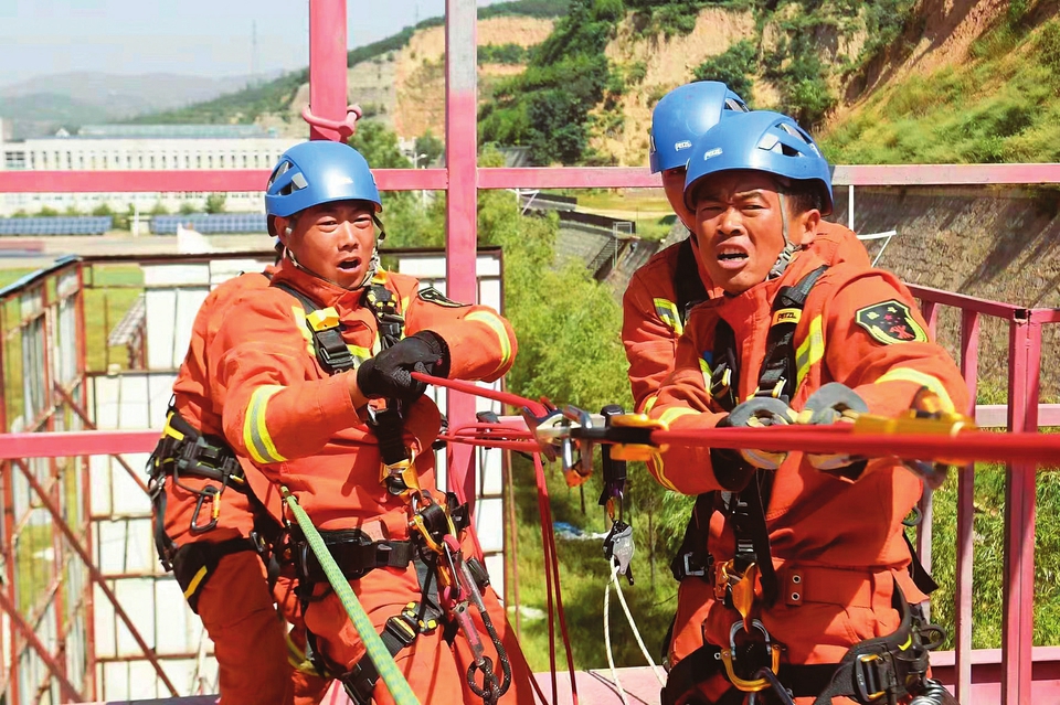 吕梁市消防救援支队北川河西路特勤站消防员开展绳索救援训练。张文兵摄