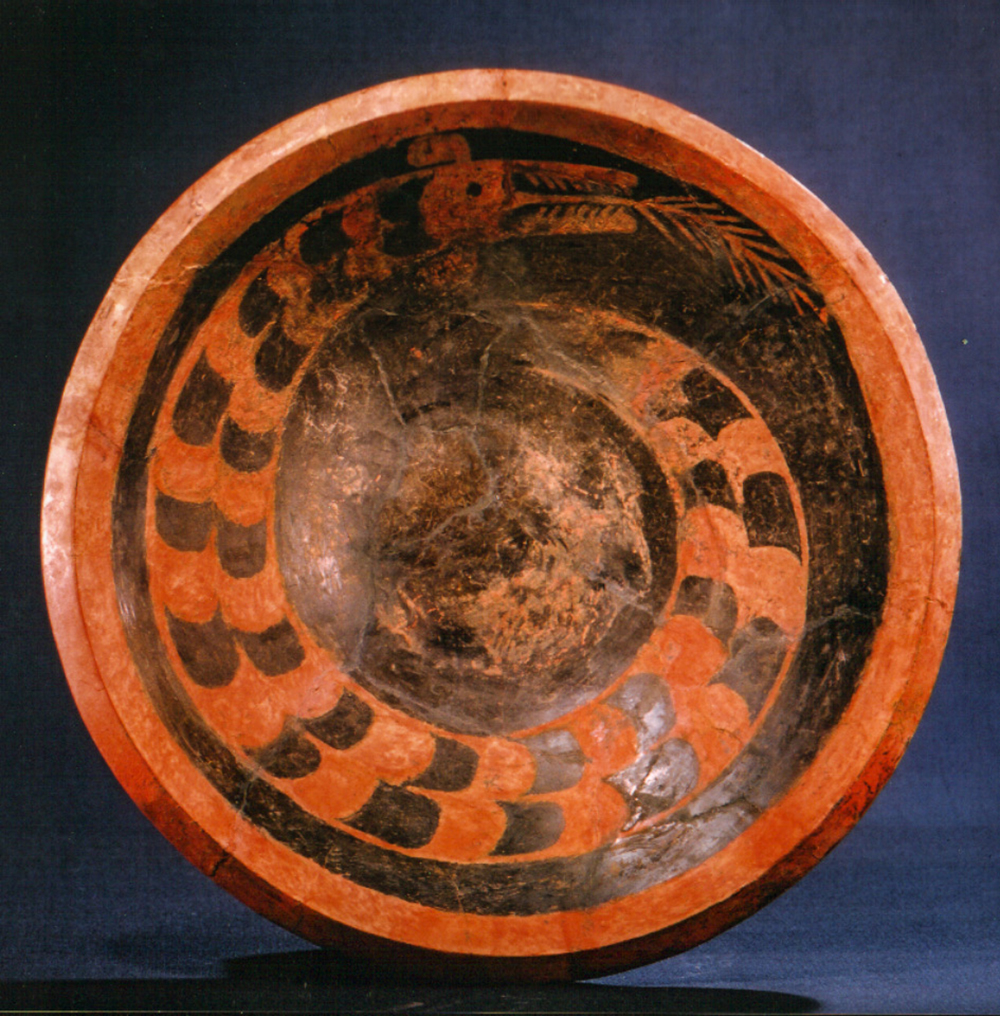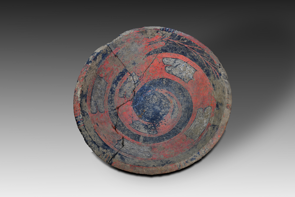 彩绘龙盘于1980年出土于陶寺遗址,灰褐色陶胎,敞口、折腹、平底,通体磨光。盘底用红彩涂色,红灰相间的蟠龙围绕红色圆盘面盘旋,蟠龙身盘如蛇,体上有似鳄鱼一样的鳞状斑纹,口衔枝状物,专家辨识后认为是禾苗。