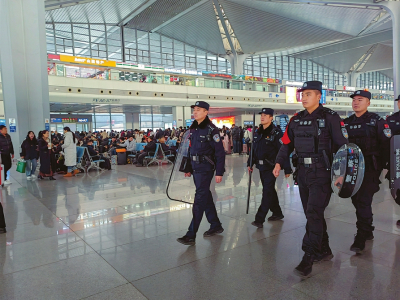 在太原南站,随处可见民警坚守一线守护平安的身影。本报记者郭宁摄