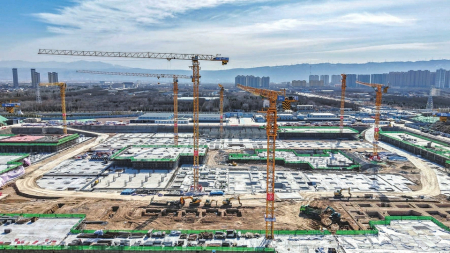2月7日,运城市人民医院建设项目(一期)工地,建筑工人投入紧张的施工中。据悉,该项目是山西省重点项目,建成后将有助于实现优质医疗资源下沉。新春伊始,施工单位抢抓建设进度,争取早日建成投用。