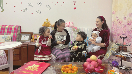 临汾记者站记者郭玉琴(左二)在临汾市水门街采访“洋媳妇”扎拉过中国年。