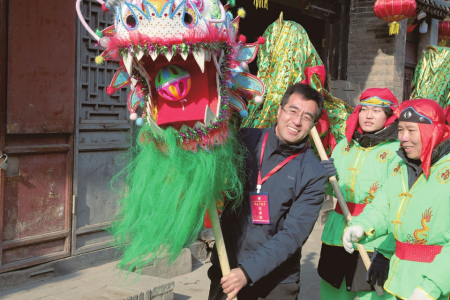 晋中记者站记者裴云锋在平遥古城采访时体验传统民俗表演。