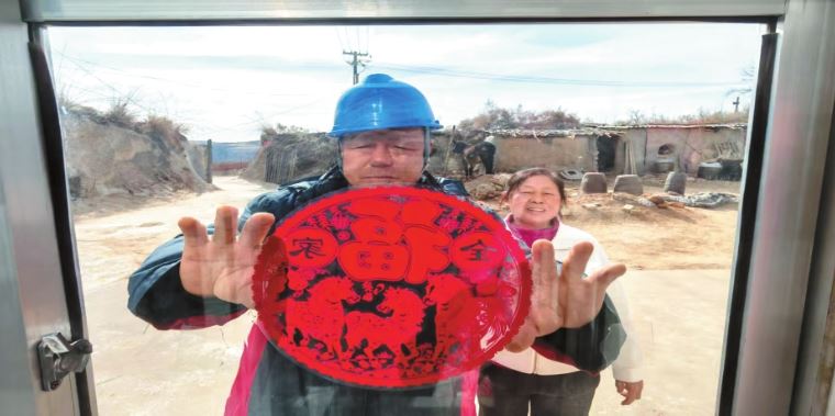 一个多小时后,皮卡车抵达红糜梁村张伟小家。张伟小是村里的放羊汉,患有高血压,定期给他捎降压药成了张吉欢的顺手工作。临别前,张吉欢仍不忘叮咛他每天按时吃药……皮卡车继续盘旋在沟壑之间,驶进更偏远的的下养仓村。张刘女和老伴早已等候多时。张吉欢卸下他们子女寄来的快递,得知今年他们的二儿子一家因工作无法返乡过年,他便默默搬来木梯,将一对红灯笼稳稳地挂在院门上。灯笼亮起时,温暖的光照在老人的脸庞上。