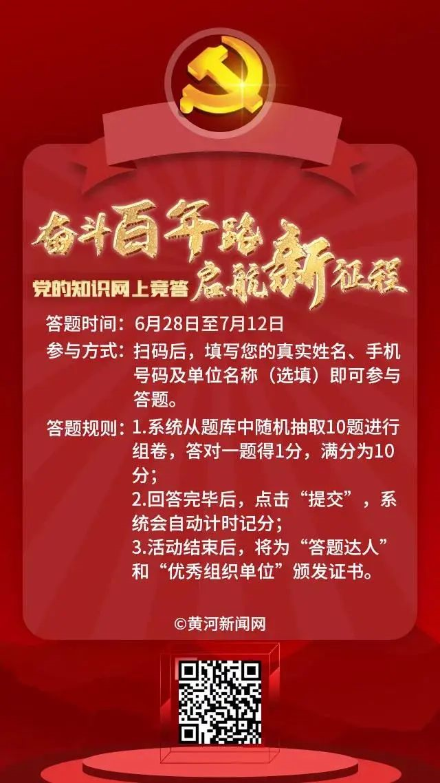 学习百年党史,传承红色基因,汲取奋进力量。为庆祝中国共产党成立100周年,重温党的光辉历程与伟大成就,扎实推动党史学习教育走深走实,由山西省委网信办指导、黄河新闻网承办的【奋斗百年路 启航新征程】党的知识网上竞答正式上线,邀您参与!