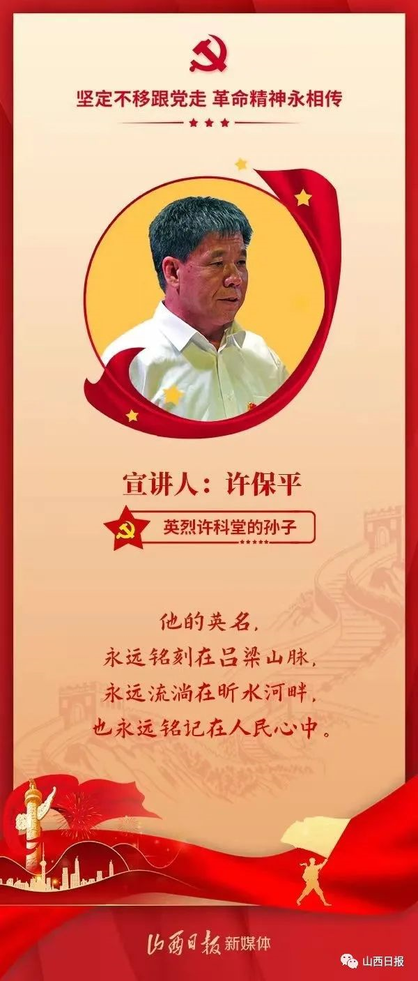 许科堂,男,1912年生,临汾市大宁县人,1938年7月1日加入中国共产党。1937年“七七”事变后,许科堂加入大宁县牺牲救国同盟会,带领群众开展抗日救亡运动。1938年先后担任白杜村党支部书记和一区农救会宣传委员。1939年5月,调到县农救会工作。1945年6月,任大宁县人民民主县长。1947年敌人偷袭刘家垣村,在突围中英勇就义,年仅35岁。